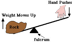 Like other simple machines, the lever is best understood through the concepts of input and output forces. The diagram above shows a lever. The hand pushing down on the lever is the input force. When the hand pushes down the rock will rise up. This is the output force. The output force can be larger or smaller than the input force, depending on the length of the lever and where you place the fulcrum.