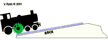 A good example of a ‘rack and pinion' gear system can be seen on trains that are designed to travel up steep inclines. The wheels on a train are steel and they have no way of griping the steel track. Usually the weight of the train is enough to allow the train to travel safely and at speed along the track. However, if a train has to go up a steep bank or hill it is likely to slip backwards. A ‘rack and pinion' system is added to some trains to overcome this problem. A large gear wheel is added to the centre of the train and an extra track is, with teeth, called a ‘rack' is added to the track. As the train approaches a steep hill or slope the gear is lowered to the track and it meshes with the ‘rack'. The train does not slip backwards but it is pulled up the steep slope