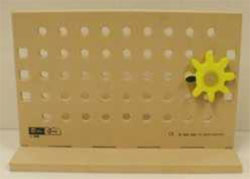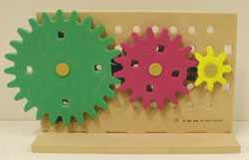 Gear model kits are very useful when learning about gears. The photographs below show a useful kit made from a soft but rigid plastic material. The parts can be put together without the use of tools and various components are supplied including a range of gear wheels. If you have the same or similar kit, set up the simple gear train shown below and attempt the exercise.