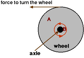 Wheel "A" is a circle. It is larger than wheel "B". The black circle. You will notice that "A" is larger than "B". The diameter of "A" is larger than "B". If you rotate "B"(the axle) it will move wheel "A". Since "B" is smaller than "A" and moves in a smaller circle than "A" you will use very little input you get a large output. The large ratio of the wheel radius to the axle radius is what makes it easy to turn the wheel at it's rim.