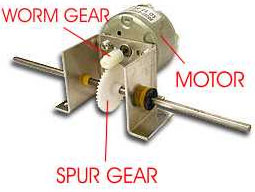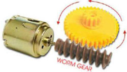 The picture to the right is a typical set-up for a motor and worm gear system. As the worm revolves the wormwheel (spur gear) also revolves but the rotary motion is transmitted through a ninety degree angle.